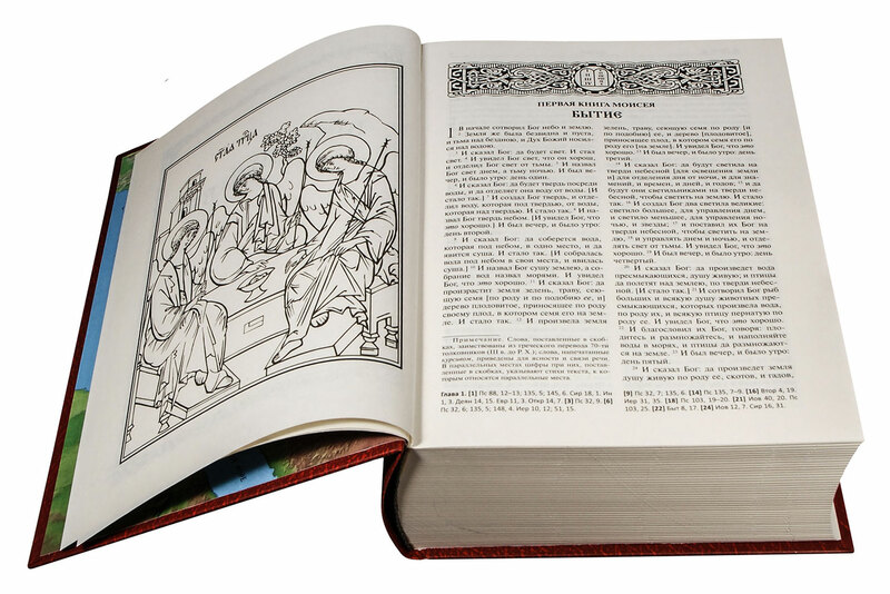 Полное издание Библии включает в себя Ветхий Завет (все канонические и неканонические книги), а также Новый Завет Господа нашего Иисуса Христа (состоит из 27 книг, в том числе четырех Евангелий — от Матфея, Марка, Луки и Иоанна, а также книги Деяний Апостолов, апостольских посланий и Апокалипсиса святого Иоанна Богослова). Кроме того, книга содержит полезные приложения, из которых читатели смогут получить подробную справочную информацию, разъясняющую встречающиеся в тексте обозначения древних денежных единиц, последовательность событий по четырем Евангелиям, по Деяниям и посланиям святых апостолов. Приводятся также указатель Евангельских и Апостольских чтений, а также цветные карты местностей Библейских времен. Книга издана в прочном твердом переплете с золотым тиснением и может использоваться в качестве подарка. Текст отпечатан на белой бумаге высокого качества.