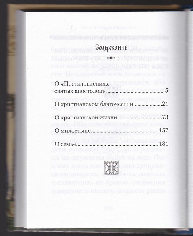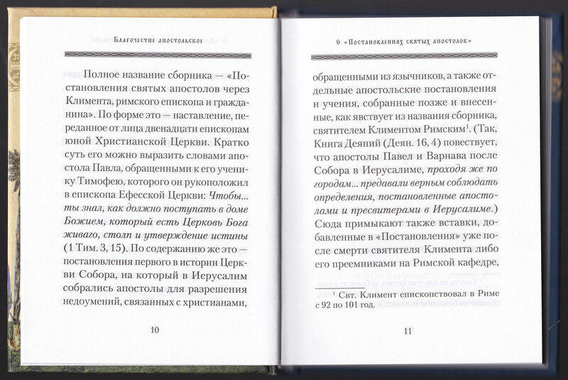 В книге содержатся выдержки из "Постановлений святых апостолов" - древнего памятника христианской письменности, который православное Предание относит к самим основателям первых Поместных Церквей - двенадцати ученикам Христовым. "Постановления" сохранили подлинный апостольский дух и с древности пользовались огромным авторитетом на Православном Востоке. Приводятся апостольские указания и разъяснения о вере, благочестии и жизни христианской.