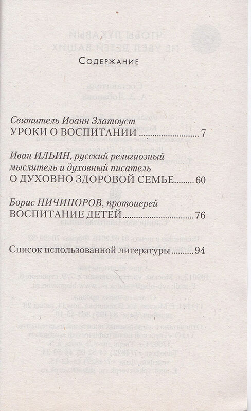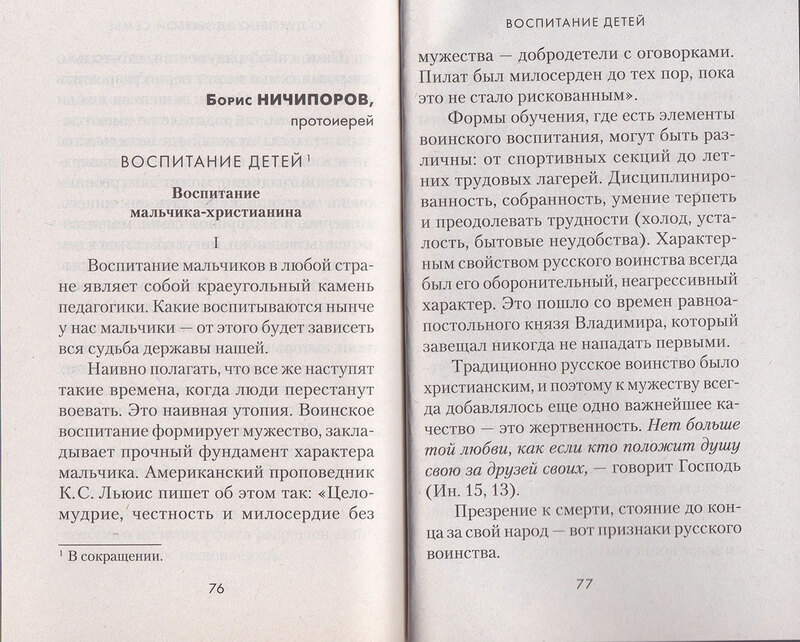 Сборник посвящен воспитанию детей в духе христианского благочестия. В него входят поучения святителя Иоанна Златоуста, размышления выдающегося русского философа Ивана Ильина и советы протоиерея Бориса Ничипорова. «Ваши дети всегда будут довольно богаты, если получат от вас хорошее воспитание, способное упорядочить их нравы и хорошо устроить их поведение. Итак, старайтесь не о том, чтобы сделать их богатыми, но о том, чтобы сделать их благочестивыми, владыками своих страстей, богатыми в добродетелях. Внимательно наблюдайте за их поступками, за их сообществами, за их связями — и не ожидайте от Бога никакой милости, если не исполняете сего долга». Эти слова святителя Иоанна Златоуста не потеряли своей значимости и сейчас. Как, впрочем, и «верное слово» апостола Павла, который говорил, что отцы и матери могут пожать плоды добродетели своих детей, когда хорошо воспитают их (Кол. 3,21–24).