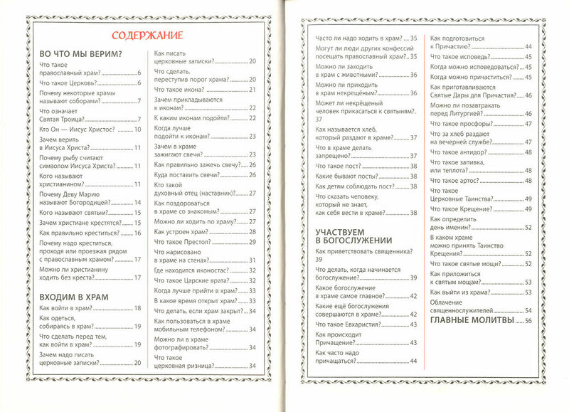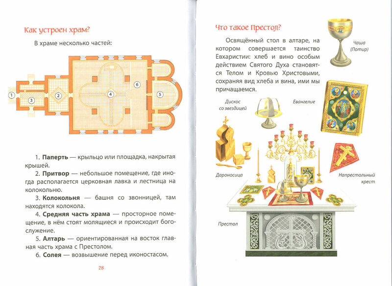 В книге с прекрасными цветными иллюстрациями ребенок найдёт ответы на самые первые и самые главные вопросы о православной вере и церковной жизни. Во что верят христиане? Как правильно одеться, собираясь в православный храм? Зачем пишут записки? Куда поставить свечи и как подойти к иконам? Как нужно молиться, чтобы почувствовать присутствие Бога? Что такое исповедь и Причастие? В книге есть ответы на 77 главных вопросов, которые возникают у детей и новоначальных христиан, приступающих к духовной жизни, а также разъясняются устройство храма и церковные традиции. Яркие и подробные иллюстрации дополняют рассказ и объясняют многие детали. Приводятся также главные молитвы, которые нужно знать новоначальным. Книга получила гриф Издательского совета Русской Православной Церкви и адресована самому широкому кругу читателей – и взрослым, и детям. Она отпечатана на плотной цветной бумаге удобным для чтения шрифтом.