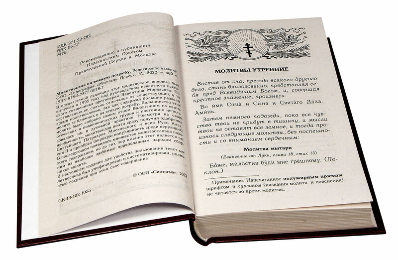 Молитвослов содержит все основные молитвы православного христианина – утреннее и вечернее правило, раздельные каноны ко Причастию и избранным святым, последование ко Святому Причащению и благодарственные молитвы, канон и часы Святой Пасхи, Богородичное правило, молитвы за ближних, молитвы разные ко Господу и Пресвятой Богородице, молитвы Архангелам и более чем 140 угодникам Божиим, молитвы о детях, молитвы в болезнях, молитвы об усопших, молитвы от нечистой силы, а также акафисты, редкие молитвы и другие молитвы на всякую потребу (всего около 150 молитв). В конце книги в разделе, посвященном исповеди, содержится примерный перечень грехов, которые нужно исповедовать. Текст набран русским гражданским шрифтом.