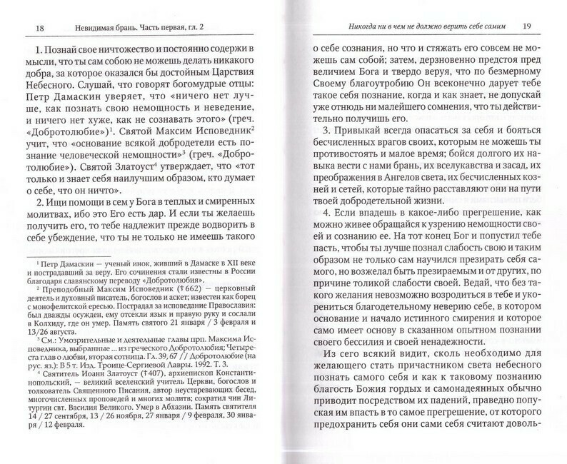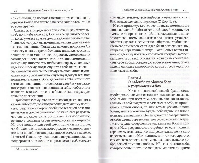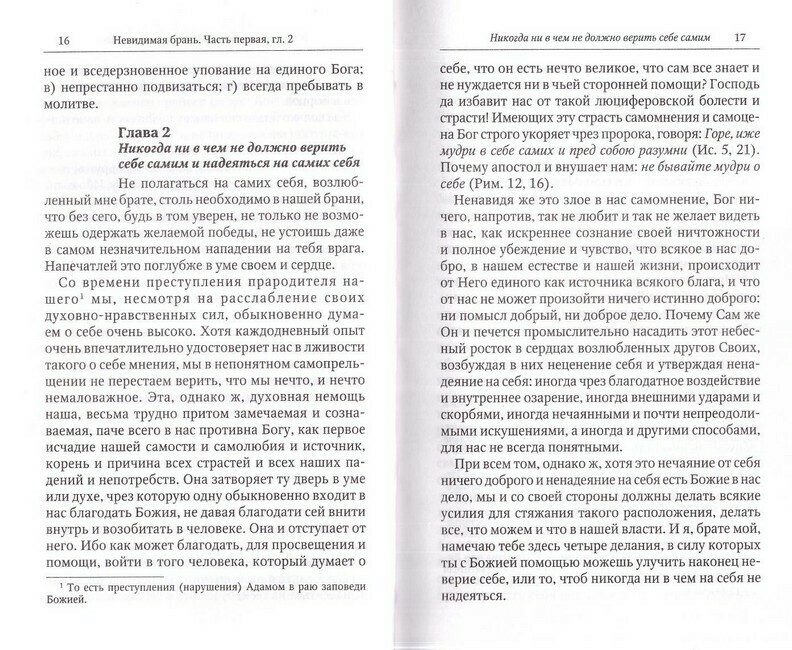 Книга выдающегося подвижника преподобного Никодима Святогорца, переведенная с греческого языка святителем Феофаном Затворником, является классическим руководством в духовной жизни, учебником для тех, кто старается исполнять заповеди Господни: прощать обиды, молиться за творящих напасти, любить даже врагов своих. Она не только рассказывает о кознях бесовских, об их лукавствах и способах нападения на нас, но и учит тому, как распознавать эти козни и противоборствовать им. Каждый православный христианин в Таинстве Святого Крещения отрекается от дьявола и всех дел его. Но потом, по собственной немощи и из-за непрестанного нападения на нас врагов нашего спасения, согрешает. По словам самого Никодима Святогорца, этой книгой «всякий человек, желающий спасения, научается, как побеждать невидимых врагов своих, чтоб стяжать сокровища истинных и божественных добродетелей, и за то получить нетленный венец и залог вечный, который есть единение с Богом и в нынешнем веке и в будущем». В Приложении помещены статьи игумена Леонтия Козлова, кандидата богословия Московской Духовной Академии – «Житие преподобного Никодима Святогорца» и «Происхождение книги «Невидимая брань». Текст отпечатан на белой офсетной бумаге.