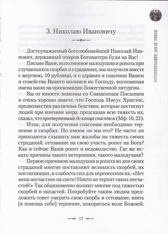 В книге опубликованы письма Афонских старцев, собранные из частных архивных источников. Письма, написанные в разные времена (XIX – начало XX века) и к разным лицам, содержат душеполезные наставления и советы, основанные на Священном Писании и святоотеческогом учении. Они – лишь малая частица той духовно-нравственной и молитвенной помощи боголюбивому русскому народу, которая поступала из Русского на Афоне Свято-Пантелеимонова монастыря в ответ на материальную поддержку, живое участие русских людей в нуждах святогорцев...