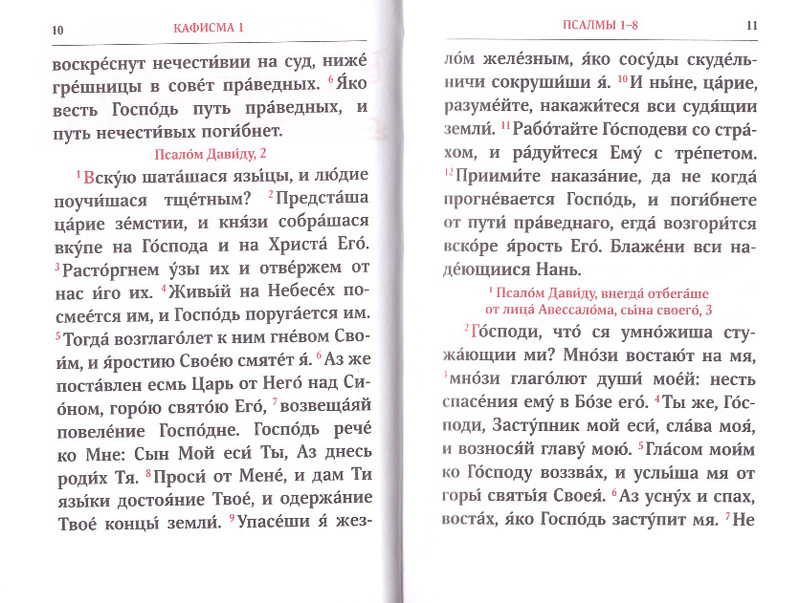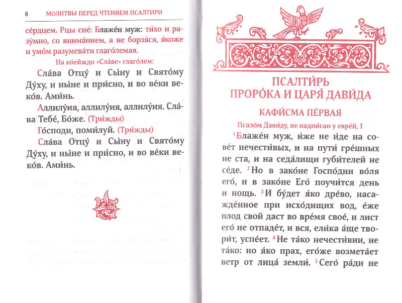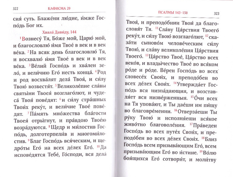 Псалтирь русским шрифтом в привычном гражданском начертании, на церковнославянском языке. Книга карманного формата поместится в сумочку или небольшой карман. Это издание Псалтири пригодится тем, кто испытывает затруднения в чтении книг, напечатанных церковнославянским шрифтом. Красивый, удобный для чтения шрифт, гармоничное художественное оформление, малый формат, твёрдый прочный переплёт — эта книга всегда должна быть рядом. Состав традиционный: 20 кафизм Псалтири пророка царя Давида; молитвы до и после чтения всей Псалтири, а также после каждой кафизмы. В дополнении объясняется, как читать Псалтирь по усопшим. По благословению Святейшего Патриарха Московского и всея Руси Кирилла. Текст отпечатан на качественной белой бумаге в две краски – черным и красным шрифтом.