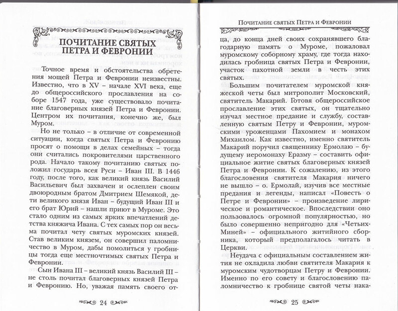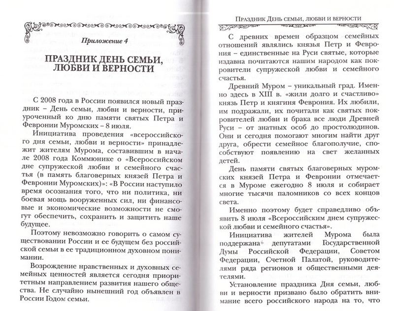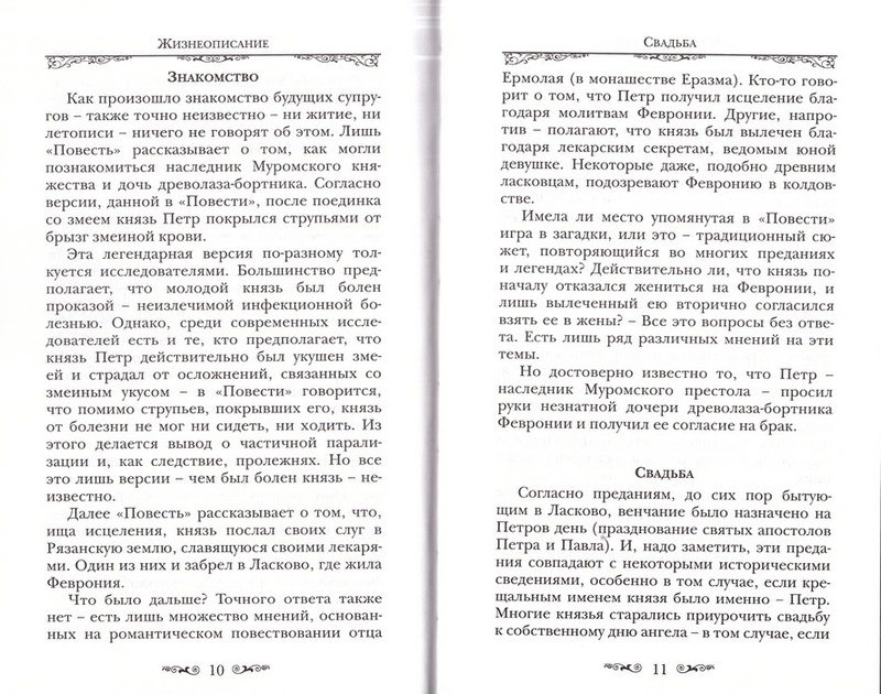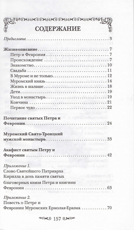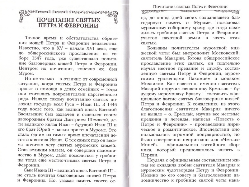 Книга о святых князе Петре и княгине Февронии Муромских содержит их жизнеописание, историю почитания, рассказ о Свято-Троицком монастыре, где покоятся их мощи, акафист и молитвы этим святым. В качестве приложений приводятся: слово Святейшего Патриарха Кирилла в день памяти святых Петра и Февронии, Повесть о Петре и Февронии Ермолая-Еразма, история Мурома, где прошла жизнь святых, рассказ о празднике День семьи, любви и верности, связанном со святыми Петром и Февронией, а также рассказы о чудесах, явленных от Господа по молитвам этих святых. Книга рассчитана на широкий круг православных читателей, издана на белой офсетной бумаге.